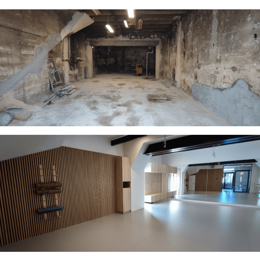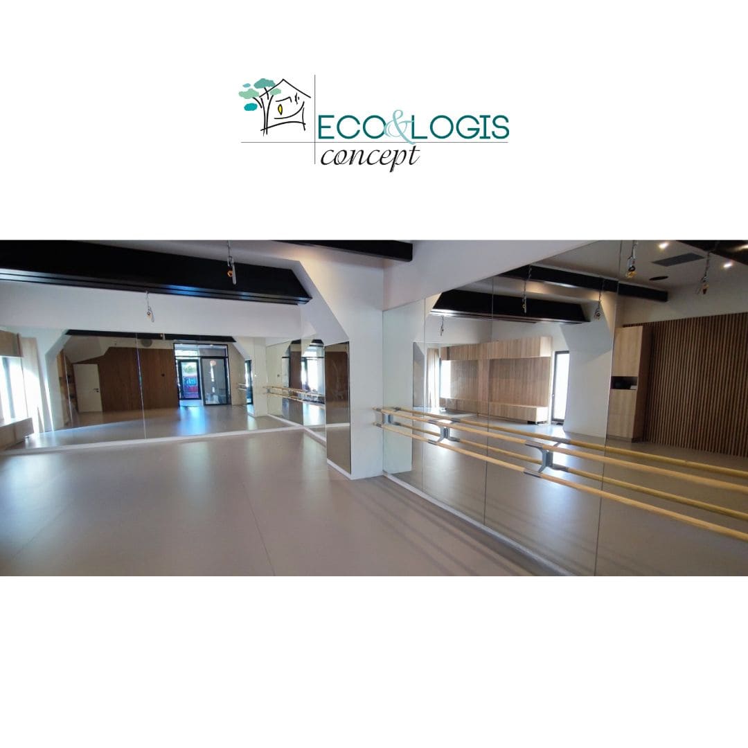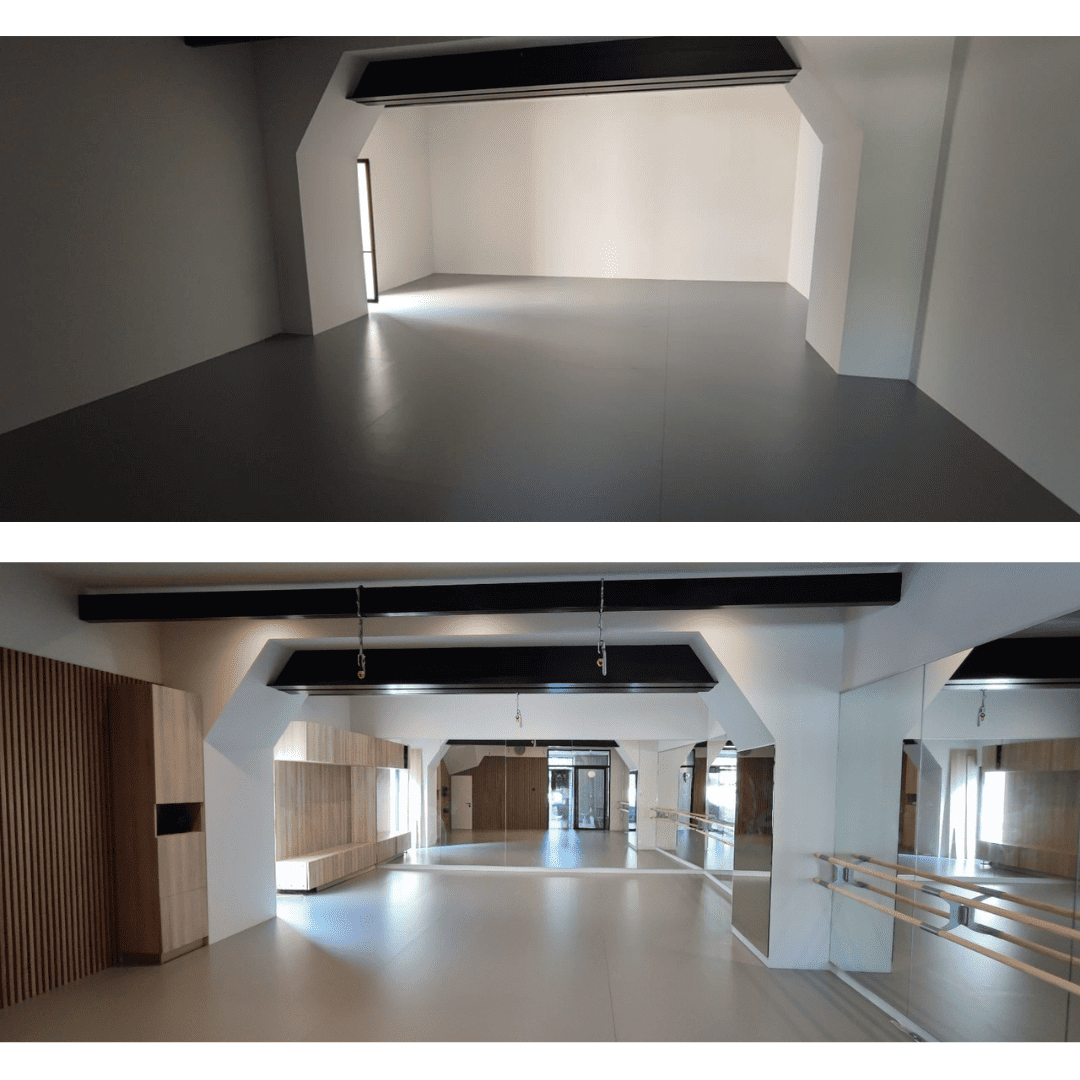 Une fois le volume créé, il fallait lui donner une âme. L'objectif ? La luminosité et la pureté. Après l'isolation et la pose du placo, la ventilation, le chauffage, notre cliente a opté pour un sol en béton ciré pour l'accueil et un plancher de danse tel que celui de l'opéra de Paris ! Monté sur demi balle de tennis pour l'amorti et le rebond, à la fois moderne et robuste, idéal pour une pratique intensive. Les murs et plafonds ont été habillés d'une peinture blanche éclatante pour maximiser la clarté.